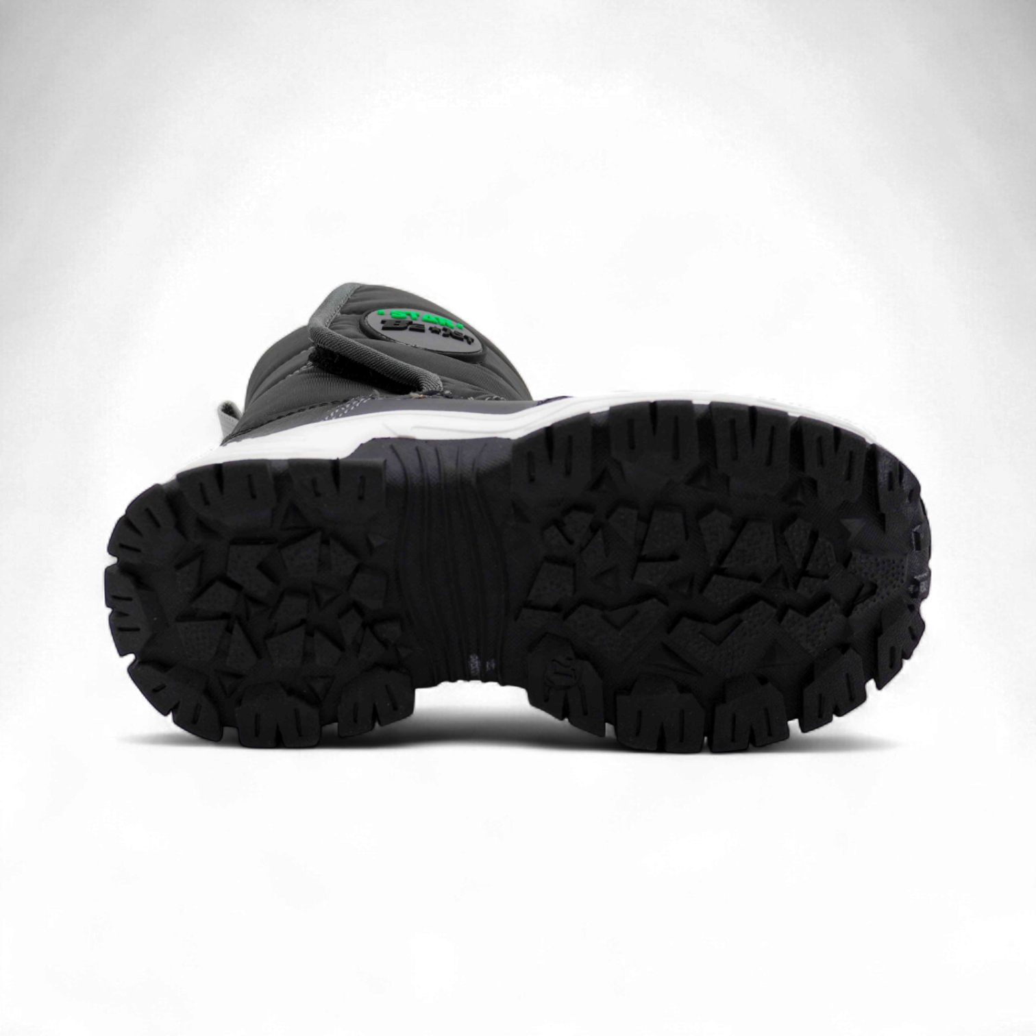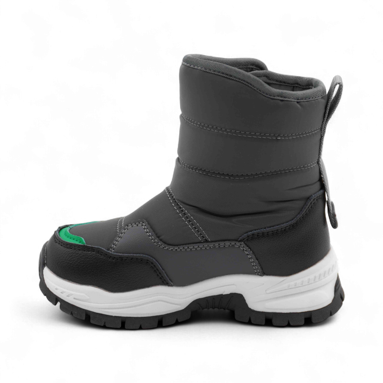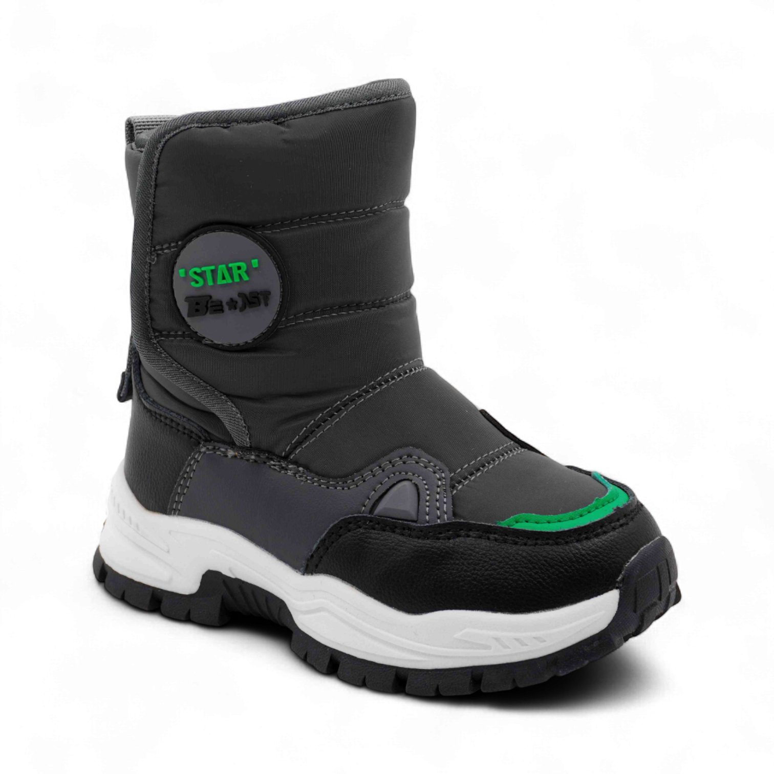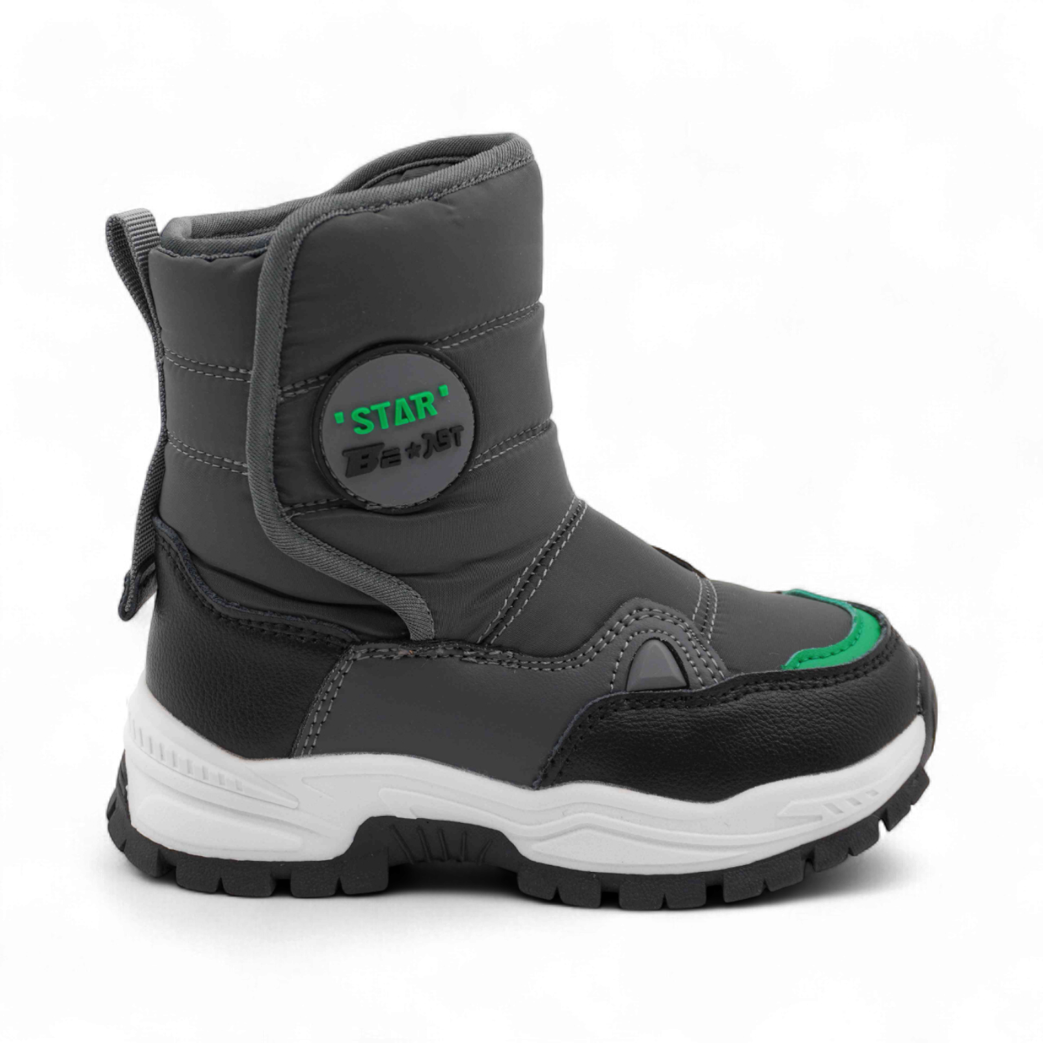 Материал: Верх обуви выполнен из непромокаемого текстиля, что обеспечивает надежную защиту от снега и влаги. Вставки из экокожи дополнительно защищают мысок и пятку сапожек от механических повреждений.