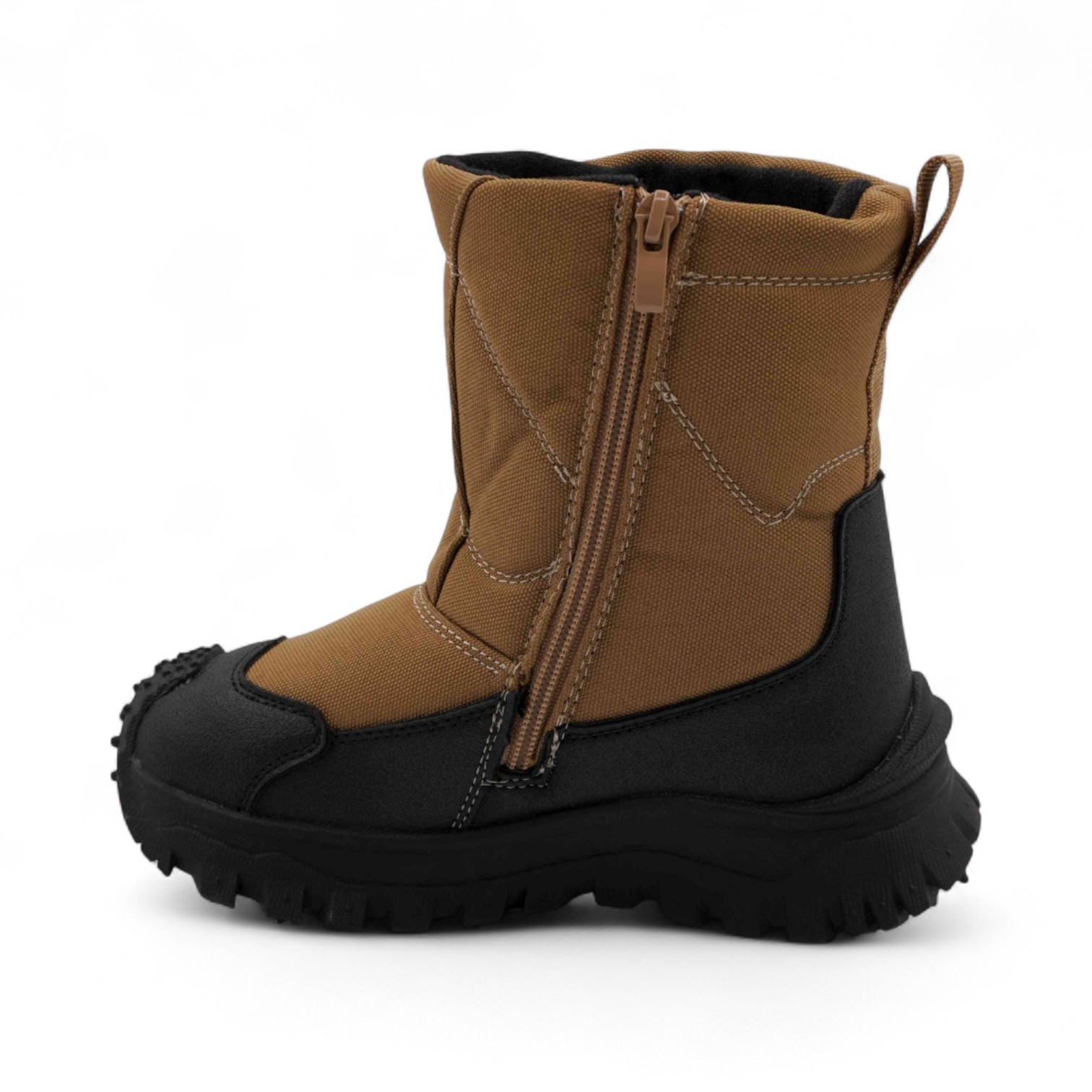 Материал: Верх обуви выполнен из непромокаемого текстиля, что обеспечивает надежную защиту от снега и влаги. Вставки из эко-кожи дополнительно защищают мысок и пятку сапожек от механических повреждений. Подкладка и стелька из искусственного меха, которая обладает отличными теплоизоляционными свойствами.
